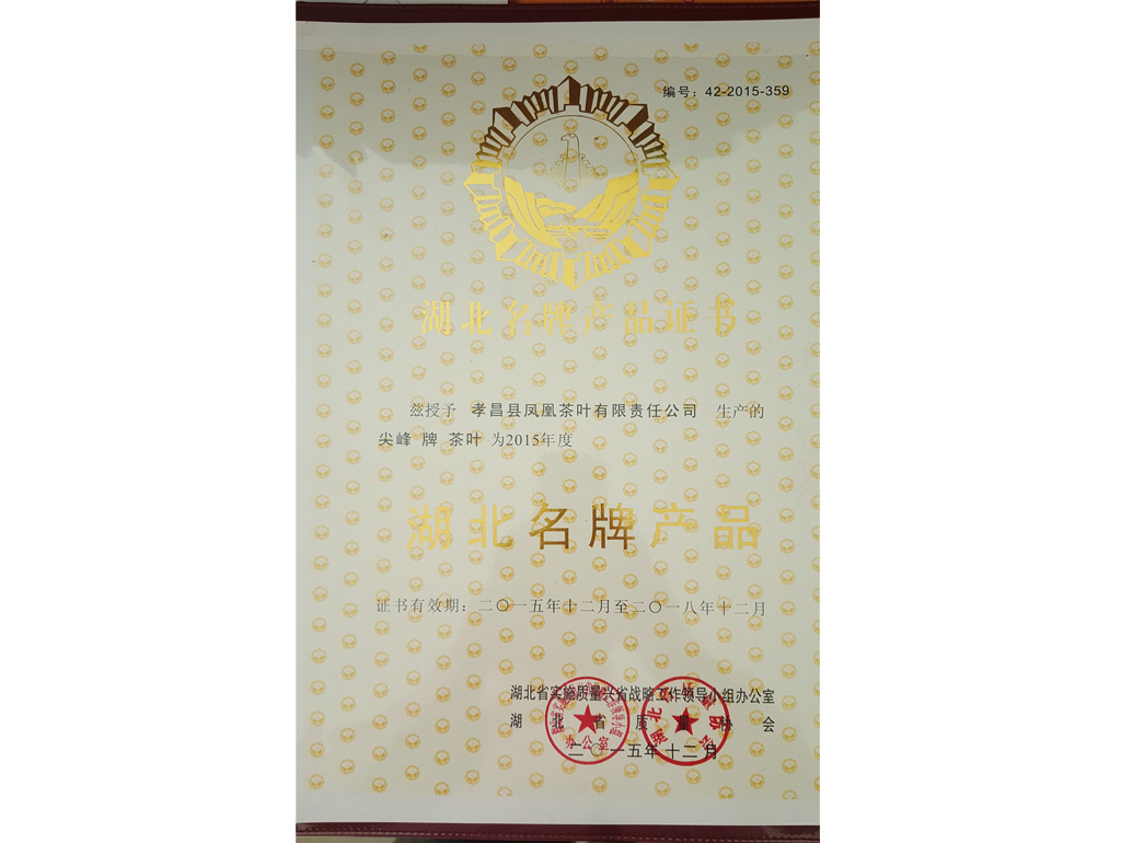 公司堅(jiān)持名牌戰(zhàn)略,樹(shù)立精品搶占市場(chǎng)的意識(shí),在采摘、制作等工藝上下功夫,以“色翠、香郁、味醇、形美”享譽(yù)市場(chǎng),形成了以“尖峰”為商標(biāo)的周巷鳳凰山茶系列品牌。2009年榮獲“湖北省名牌產(chǎn)品”、“湖北省著名商標(biāo)”和“湖北省十大旅游名茶”三項(xiàng)榮譽(yù),2010年榮獲“孝感市六大名茶”“全國(guó)知名品牌農(nóng)產(chǎn)品”, 2011年榮獲“孝感市農(nóng)業(yè)產(chǎn)業(yè)化十強(qiáng)龍頭企業(yè)“稱(chēng)號(hào),2011年榮獲中國(guó)國(guó)際林業(yè)產(chǎn)業(yè)博覽會(huì)暨中國(guó)義烏國(guó)際森林產(chǎn)品博覽會(huì)金獎(jiǎng),2012年再次獲得“湖北省名牌產(chǎn)品”稱(chēng)號(hào),2013年農(nóng)業(yè)部主辦的綠色食品、有機(jī)食品博覽會(huì)榮獲優(yōu)秀產(chǎn)品獎(jiǎng)。2014年“周巷鳳凰茶”成功申請(qǐng)中國(guó)地理標(biāo)志產(chǎn)品,“尖峰”商標(biāo)再次榮獲“湖北省著名商標(biāo)”。